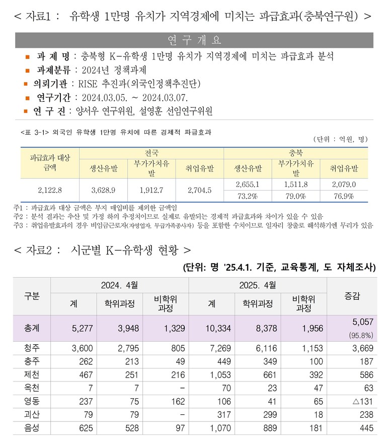 *‘24. 충북연구원 ’충북형 K-유학생 1만명 유치가 지역경제에 미치는 파급효과 분석‘ 정책연구 자료(등록금,생활비, 체재비 등) / 한국관광데이터랩 자료