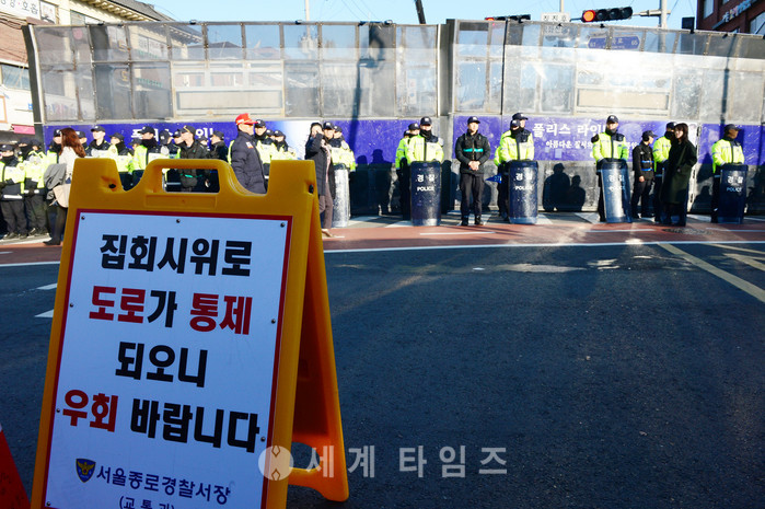 박근혜 대통령 탄핵심판 선고일인 10일 오전 서울 종로구 헌법재판소 입구에 경찰이 차벽을 세우고 경계근무를 강화하고 있다. 2017.03.10.