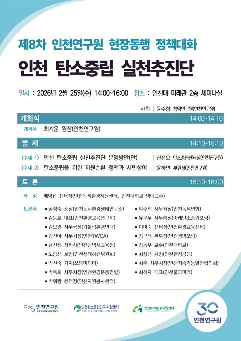 최계운 인천연구원장은 이번 논의를 바탕으로 “인천 탄소중립 실천추진단의 운영체계를 구체화하고, 자원순환 등 시민참여 기반의 생활밀착형 실천과제를 확산할 수 있는 협력체계를 강화하여 실효성 있는 정책이 제안될 수 있는 기반을 마련하겠다”고 밝혔다.