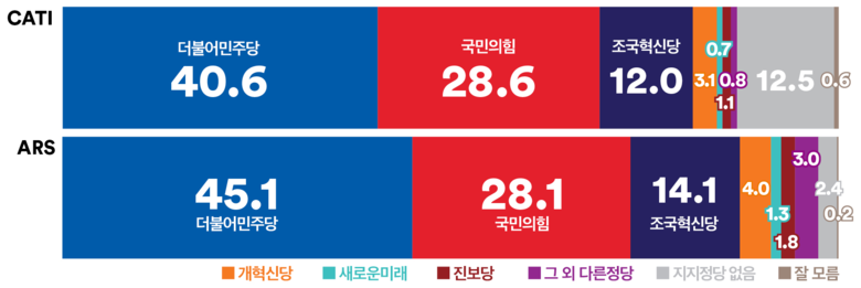 같은 기간 진행한 ARS조사 결과, ‘더불어민주당’은 지난주보다 1.8%p 상승한 45.1%, ‘국민의힘’은 2.8%p 하락한 28.1%, ‘조국혁신당’은 0.1%p 하락한 14.1%로 조사되었다. 양당 간 격차는 지난 주보다 4.6%p 더 벌어져 17.0%p로 나타났고 ‘더불어민주당 + 조국혁신당’과 ‘국민의힘’ 격차는 31.1%p로 집계되었다.