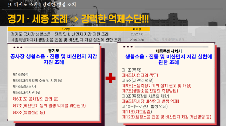 그럼에도, 지방정부의 강력한 의지에 따라 전혀 다른 결과를 만들 수 도 있음을 주장했다. 그 구체적인 예로, 먼저, 행정적 조치로는 경기도의 ‘공사장 소음 측정기.CCTV 등 설치 의무화’와 강남구의 ‘24시간 소음민원기동반’ 운영 등을 소개하였다.
