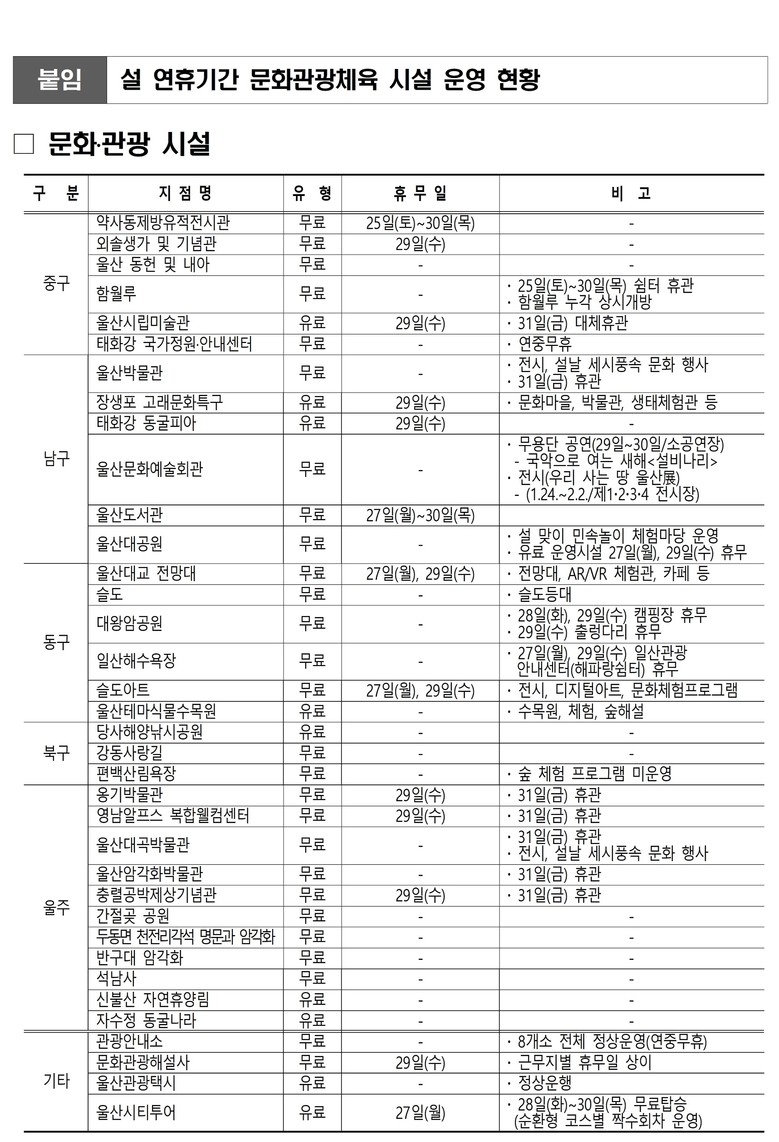 아울러 울산을 찾는 관광객의 불편을 줄이고자 울산 내 관광안내소 8개소 모두 정상 운영하고, 문화관광해설사도 관광지별 탄력적으로 운용해 공백을 최소화한다.