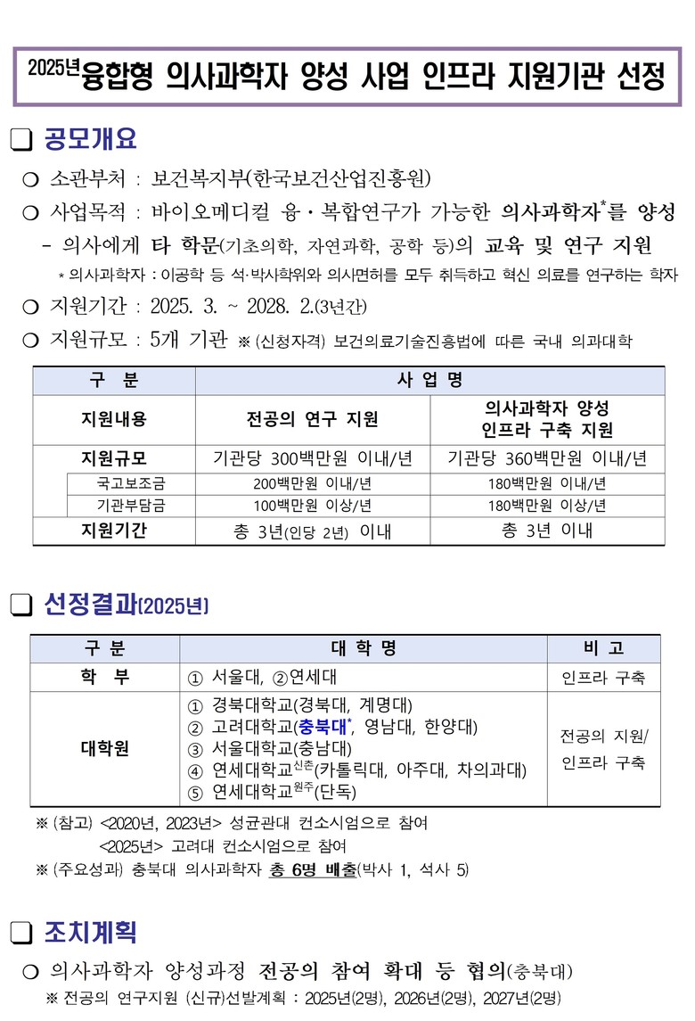 충북대는 이번 사업을 통해 의사과학자 양성을 위한 연구비 지원과 함께 ▲공통과정 온라인 강의 제작 ▲전공의 및 의대생 대상 인재 확보 플랫폼 구축 ▲심포지엄 및 성과교류회 개최 등을 추진하여 의사과학자 양성 시스템을 더욱 강화할 계획이다.