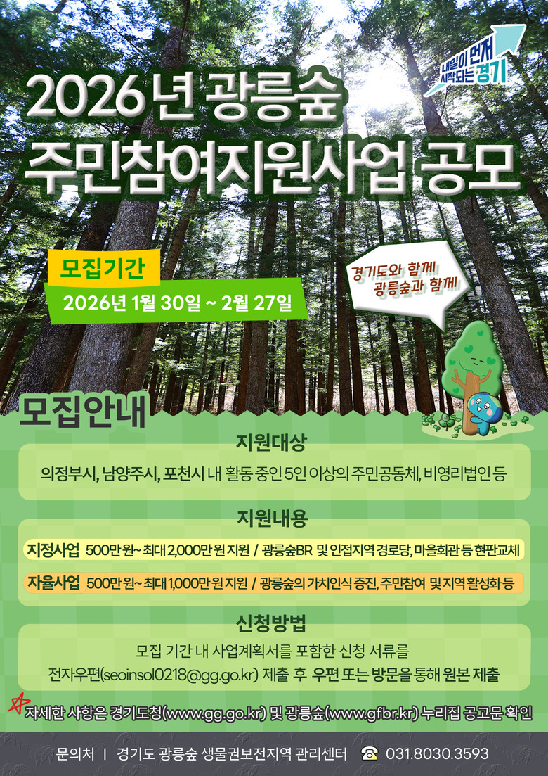 - 1월 30일 ~ 2월 27일 모집 [경기북부 세계타임즈=송민수 기자] 경기도가 광릉숲 생물권보전지역 활성화를 위해 2026년 광릉숲 주민참여지원사업 참여자를 모집한다.