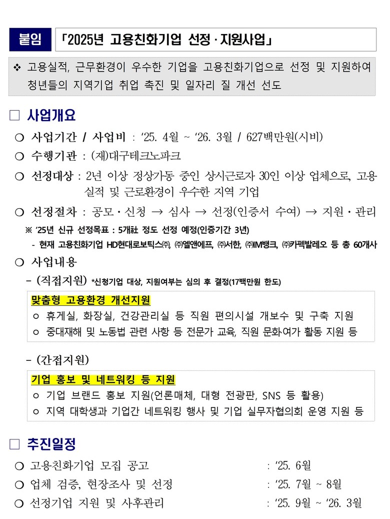 자세한 내용은 대구광역시 및 대구일자리포털 홈페이지, 대구테크노파크 홈페이지(https://dgtp.or.kr)또는 고용친화기업 홈페이지(https://goodjob.daegu.kr)에서 확인할 수 있으며, 신청 관련 세부 사항은 대구테크노파크 기업지원단(☏ 053-757-3736)으로 문의하면 된다.
