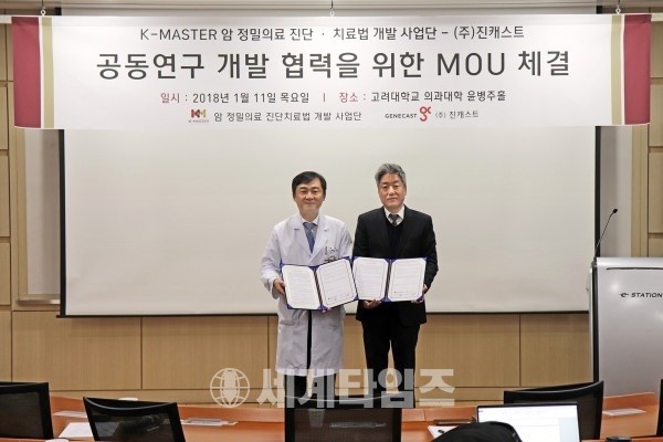 유전자 암 검진 스타트업인 진캐스트와 고려대학교 암 정밀의료 진단·치료법 개발 사업단(이하 K-MASTER 사업단)이 11일 고려대학교 의과대학 윤병주홀에서 ‘정밀의료 기반 암 진단 키트 개발 공동 연구’에 관한 업무협약을 맺었다.