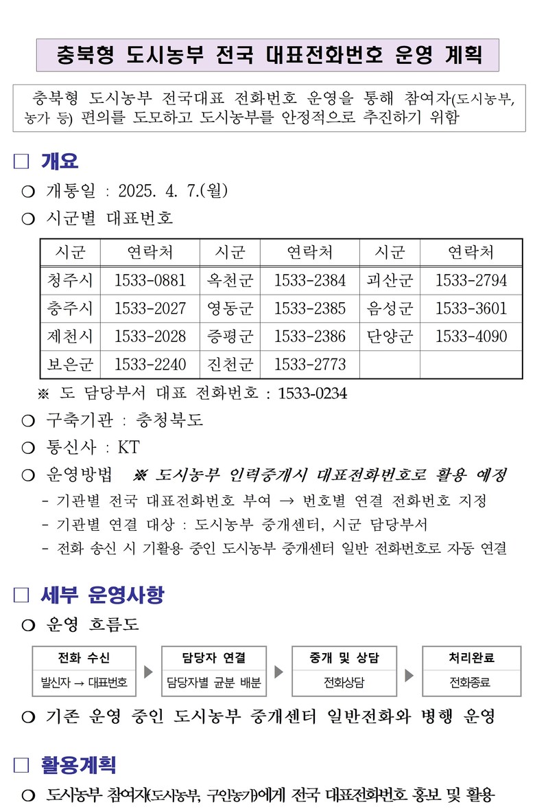 충북도는 이 같은 대표전화 시스템을 적극 홍보해 도시농업 참여자들에게 실질적인 편의를 제공할 방침이다.