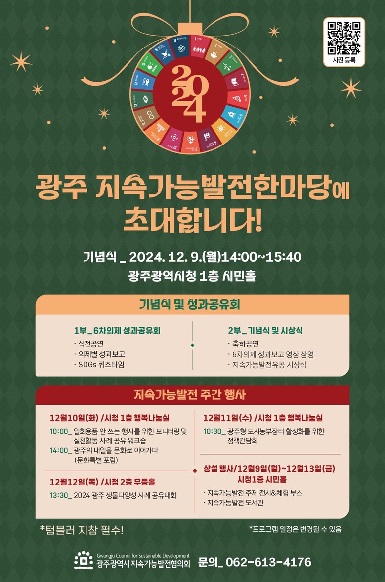광주광역시(시장 강기정)와 광주광역시지속가능발전협의회는 오는 9일부터 13일까지 시청 시민홀에서 ‘2024 광주지속가능발전 한마당’을 개최한다.