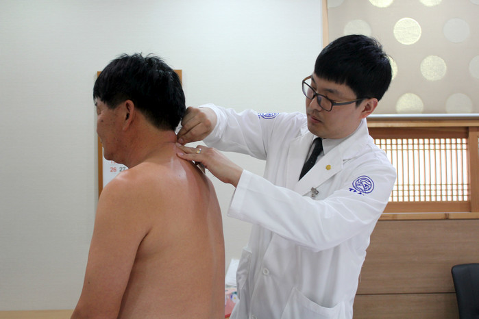 | ▲대전자생한방병원 의료진이 공주시 주민에게 침치료를 실시하고 있다 |