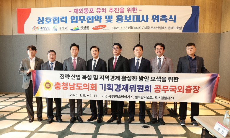 이번 공무국외출장의 단장을 맡은 지민규 의원은 “이번 방문을 통해 도내 기업의 미국 진출을 위한 무역박람회 지원 확대와 해외사무소 지원 기준 마련 및 활성화 방안을 논의했으며, 베이밸리의 성공 추진을 위한 행・재정적 지원 방향을 모색했다”며 “출장 결과에 대한 결과보고서를 충실히 작성해 의원들과 함께 공유하고, 충남이 글로벌 경제의 중심지로 도약할 수 있도록 의회 차원의 지원을 아끼지 않겠다”고 강조했다.