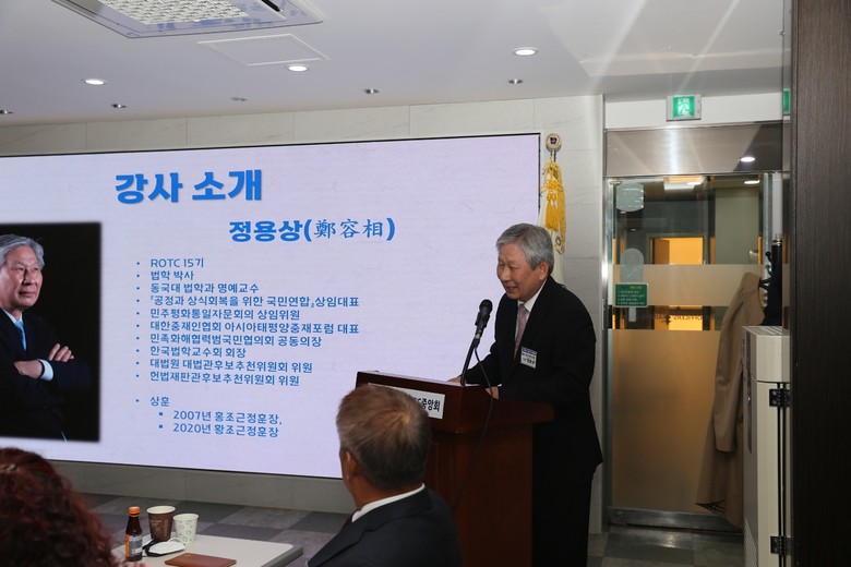 [세계타임즈 백진욱 기자] 지난 10월 25일 《공정과 상식 회복을 위한 국민연합》의 정용상 상임대표(동국대 명예교수(ROTC 제15기, 제3공수특전단)가 “위기의 한반도! 남북통합과 통일의 새 길을 위한 모색”이라는 주제로 대한민국ROTC중앙회관 5충 명예의 전당 홀에서 열린 대한민국예비역장교연합회 초청토론회에서 강연을 했다고 밝혔다.