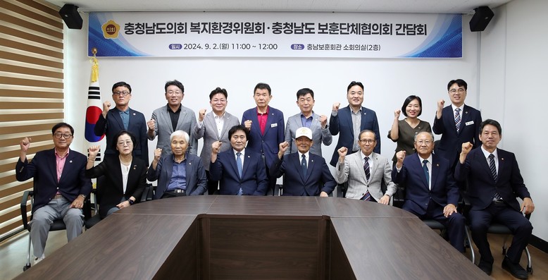 이날 간담회에는 김민수 위원장(비례‧더불어민주당)을 비롯한 복지환경위원회 위원과 충청남도 9개 보훈단체 지부장(광복회‧상이군경회‧전몰군경유족회‧전몰군경미망인회‧무공수훈자회‧고엽제전우회‧특수임무유공자회‧6‧25참전유공자회‧월남전참전자회 충남지부)이 참석했다.