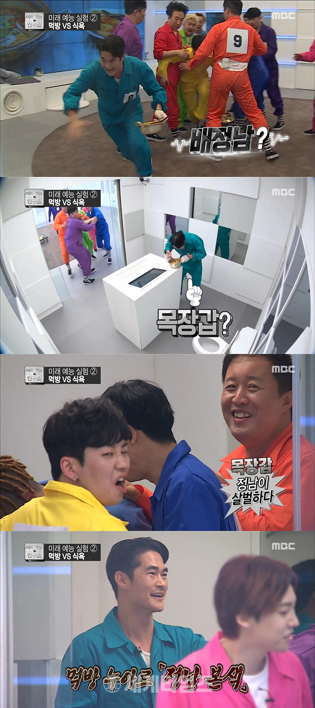 라면 냄비를 앞에 두고 멤버들과 게스트들이 실랑이를 벌이는 순간, 갑자기 배정남이 목장갑을 낀 채 나타나 뜨거운 라면 냄비를 들고 도망가 구석에서 라면을 흡입해 웃음을 자아냈다.