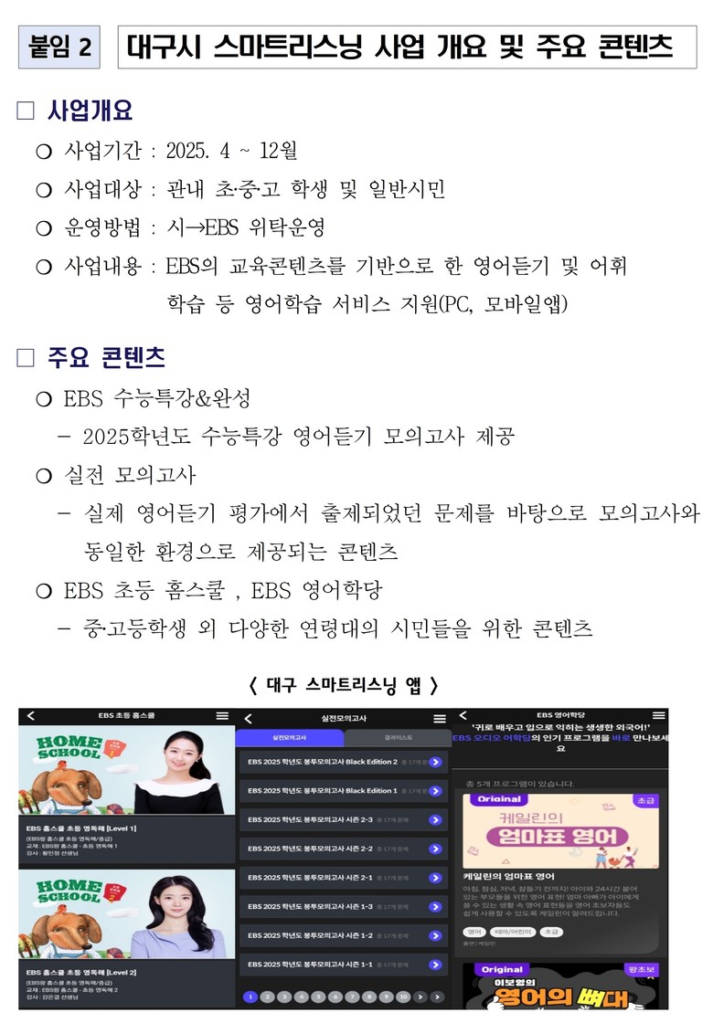 대구 시민이라면 누구나 ‘대구 스마트리스닝’ 앱을 다운로드하거나 홈페이지(daegu.slkedu.com)에 접속해 회원가입을 하면 무료로 연중무휴 서비스를 이용할 수 있으며, 주요 콘텐츠로는 ▲EBS 수능특강&완성, ▲실전 모의고사, ▲EBS 초등 홈스쿨, ▲EBS 영어학당 등이 있다.