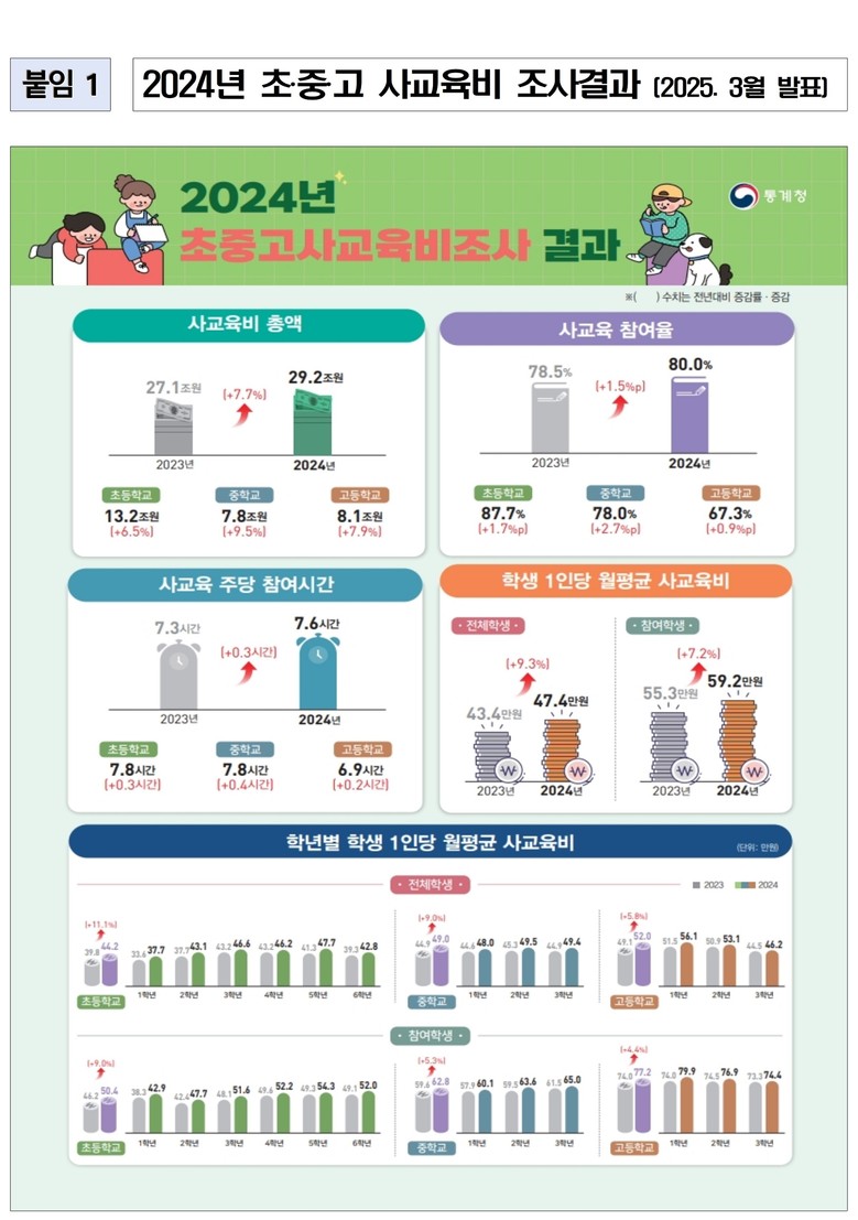 한편, 교육부와 통계청이 지난 3월 발표한 2024년 초·중·고 사교육비 조사 결과에 따르면, 전체 사교육비 지출은 전년 대비 7.7% 증가했으며, 과목별로는 영어가 학생 1인당 월평균 사교육비가 가장 높은 과목으로 나타났다.