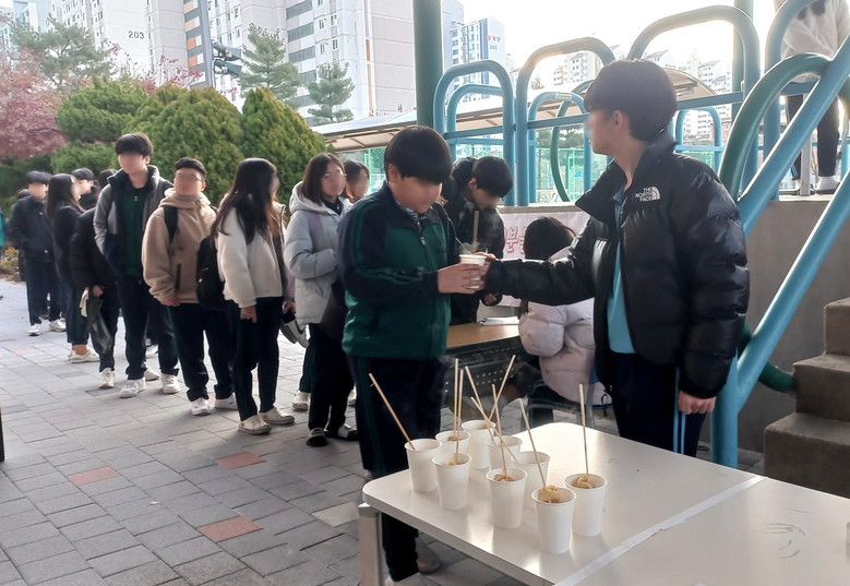행사는 학교 중앙현관 입구에서 진행되고 있으며, 학생들은 등교 시간에 동아리 학생들이 직접 만든 따뜻한 어묵탕을 맛보며 추운 날 훈훈하고 따뜻한 등교의 시간을 만들어 주었다.
