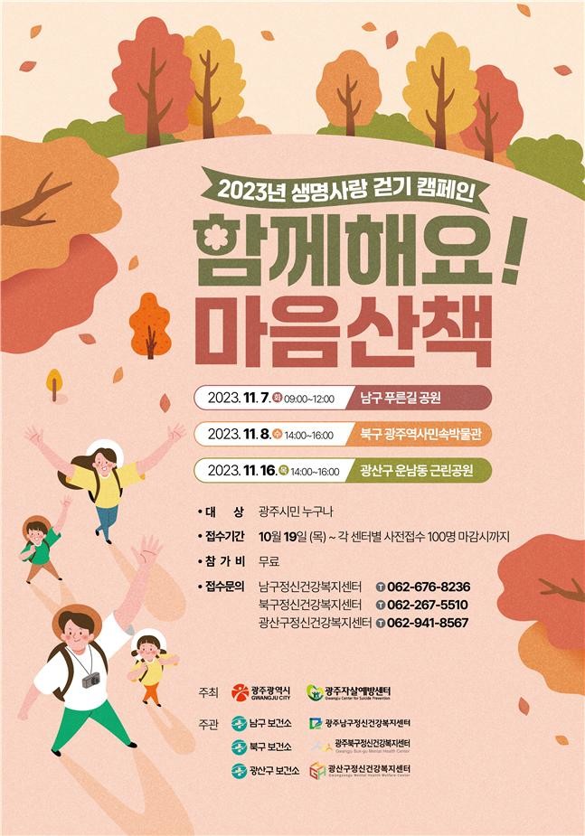 광주시, 광주자살예방센터, 3개 자치구(남구, 북구, 광산구) 정신건강복지센터 공동 주관으로 마련된 이번 행사는 ‘함께해요! 마음산책!’을 주제로 열린다.