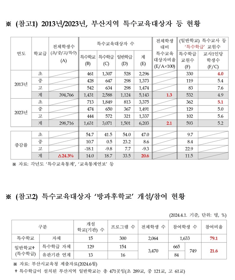 특수학교와 일반학교 간 장애아동의 교육참여 격차는 ‘방과후학교’에서도 확인된다. 부산시교육청 자료에 따르면, △‘특수학교’의 경우 15개 모든 학교에 방과후학교 프로그램이 개설.운영중이만 △‘특수학급’의 경우는 개설 학교 수가 27.4%에 그친다(전체 특수학급 설치학교 471곳 중 129곳). 이에 따라 장애아동의 방과후학교 참여율은 △특수학교 79.1%, △일반학교의 특수학급 아동은 21.6%로 차이가 발생한다. 그 밖에 지원인력인 특수교육실무원 및 사회복무요원 등의 보조인력 규모도 특수학교와 일반학교간 큰 차이를 보여 확충에 대한 노력이 필요한 상황이다.