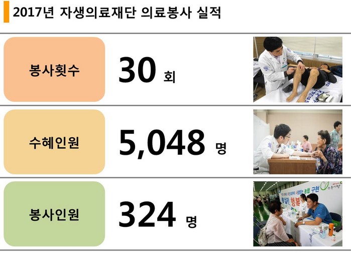 이에 자생한방병원 의료진과 임직원들은 농어촌을 방문해 의료사각지대에 있는 지역민들을 대상으로 맞춤형 건강 상담과 한방 치료를 실시했다. 2011년부터 2017년까지 의료봉사 수혜인원은 3만6000여명이며 봉사인원은 1700여명이다.