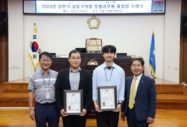 이번 표창은 지방의회 인사권 독립 후 처음 실시한 것으로 적극적이고 성실한 자세로 의정 업무를 추진하여 ‘일하는 의회, 소통하는 의정, 신뢰받는 남동구의회’ 구현을 위해 기여한 공이 큰 최해성 주무관과 최정일 주무관을 2024년 상반기 모범공무원으로 선정하여 표창장을 전달했다.