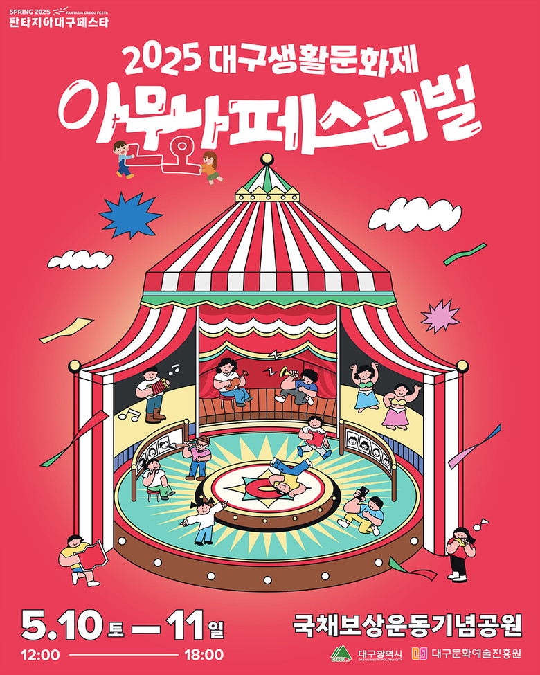 누구나 참여할 수 있는 ‘대구생활문화제’는 5월 10일(토)부터 11일(일)까지 국채보상운동기념공원에서 개최된다. 도자기, 가드닝 등 체험 프로그램과 동호회 공연이 어우러진 시민 주도형 축제로, ‘아무나페스티벌’이라는 슬로건 아래 일상의 문화가 예술이 되는 순간을 제공한다.