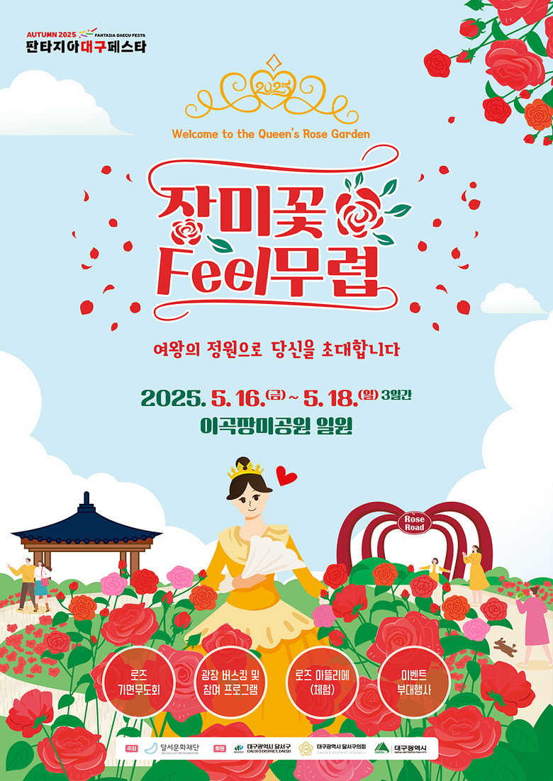 도심 속 장미정원에서 즐기는 환상적인 3일 ‘장미꽃 필(Feel) 무렵’은 5월 16일(금)부터 18일(일)까지 이곡장미공원에서 개최된다. ‘장미 여왕의 초대’를 테마로, 120여 종 17,000여 그루의 장미가 피어나는 가운데 가면무도회, 청소년 공연, 거리예술 등 다채로운 볼거리를 제공한다.