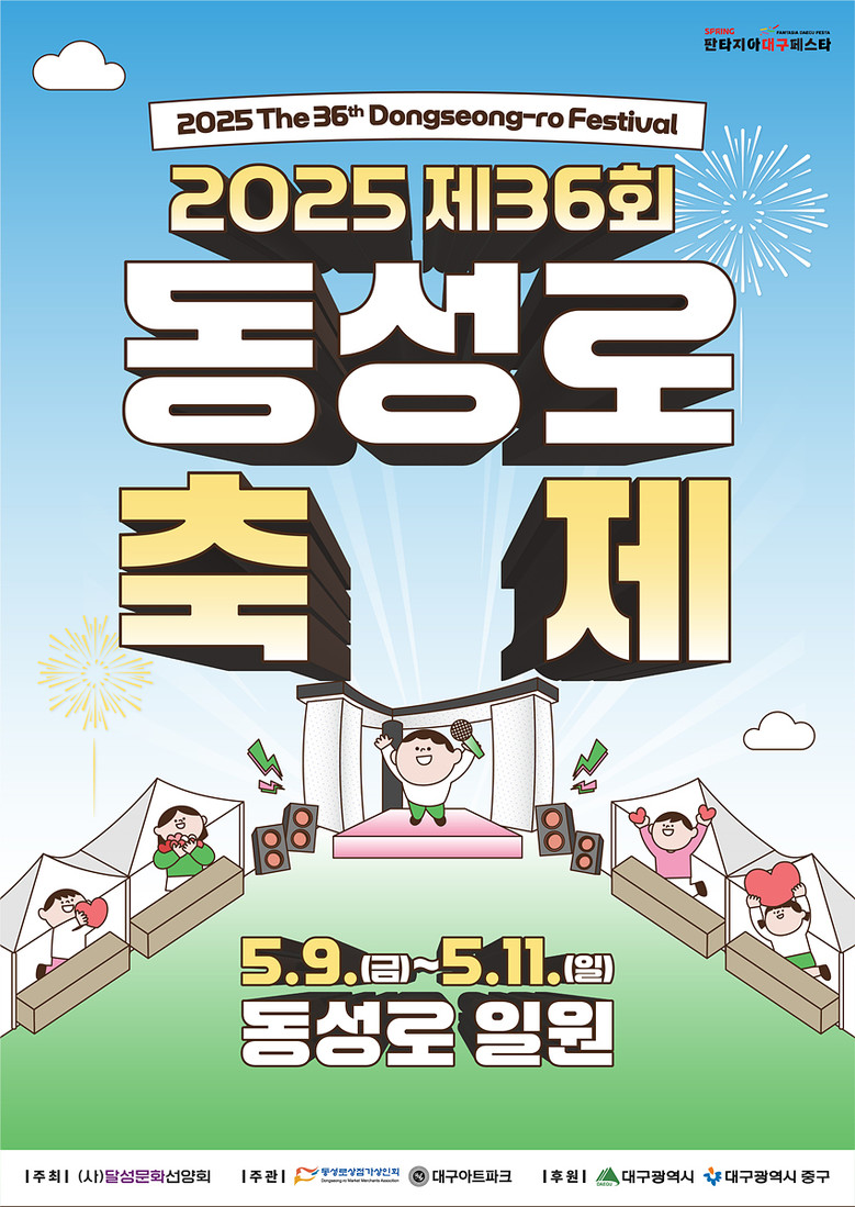 도심 속 문화예술 거리 축제의 진수 ‘동성로축제’는 5월 9일(금)부터 11일(일)까지 대구 동성로 일원에서 개최된다. 가요제, 뮤지컬 갈라쇼, 해외 공연팀 무대, 공군군악대 연주, 마술, 먹거리 부스까지 총망라된 시민 축제로 동성로가 가득 찰 예정이다.