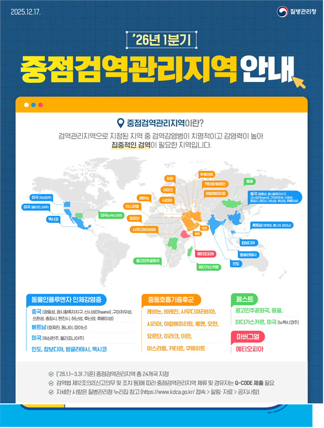 한편, 해외유입감염병 예방과 확산 차단을 위해 질병관리청은 올해(2026년) 1분기 중점검염관리지역 24개국을 지정·발표했으며, 해당국가(지역) 체류·경유자는 큐코드(Q-CODE) 또는 건강상태질문서를 제출해야 한다.