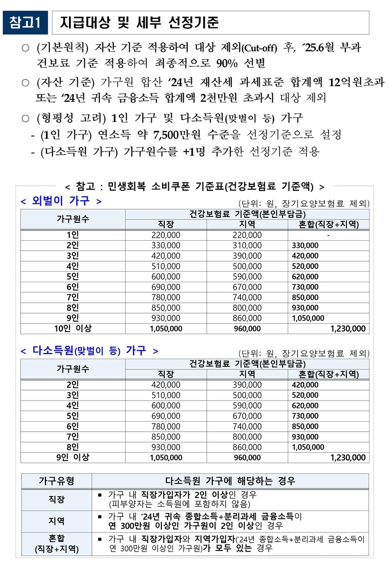 지원 대상은 2025년 6월 18일 기준 주민등록 세대별 구성원을 기준으로 소득 하위 90%까지다. 다만, 고액자산가 가구는 우선 제외된다. 구체적으로 ▲2024년 재산세 과세표준 합계액 12억 원 초과 ▲2024년 귀속 금융소득 합계액 2천만 원 초과 가구는 지급 대상에서 제외된다.