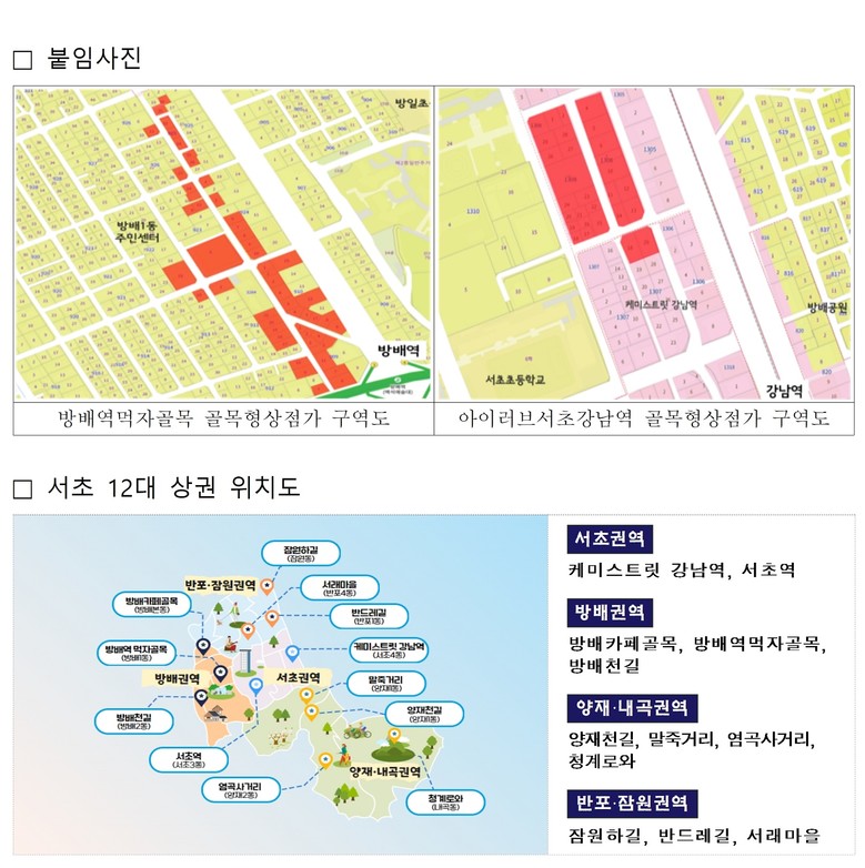 전성수 서초구청장은 “이번 골목형상점가 제5, 6호 동시 지정으로 지역경제와 골목상권 활성화의 기반을 다지는 계기가 되길 바란다”며, “내년 상반기까지 12개 주요 상권에 골목형상점가 지정을 완료하고 서초의 골목 곳곳이 문전성시를 이루도록 최선을 다하겠다”라고 밝혔다.