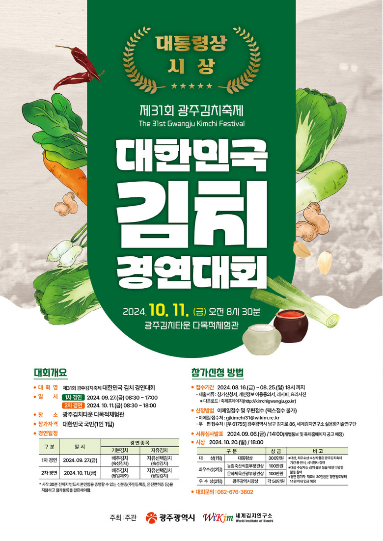 - 10월11일 20개팀 본경연…대상에 대통령상·상금 300만원 [광주 세계타임즈=손권일 기자] 광주광역시(시장 강기정)는 ‘2024 대한민국 김치 경연대회’ 참가자를 오는 16일부터 25일까지 모집한다.