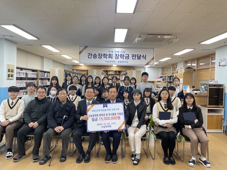 [아산시 세계타임즈=백택기 기자] 아산시 음봉중학교(교장 황성서)는 12월 20일(수) 본관 3층 간송도서관에서 간송장학회(이사장 남상만) 장학금(총 1,500만원)을 전달하는 교육기부 행사를 가졌다고 밝혔다.
