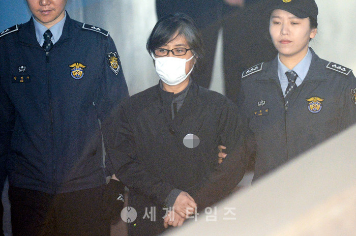 국정농단 비선실세 최순실 씨가 17일 오전 서울 서초구 서울중앙지법에서 열린 직권남용권리행사방해 등의 8차공판에 출석하기 위해 호송차에서 내려 법정으로 향하고 있다. 2017.03.17.