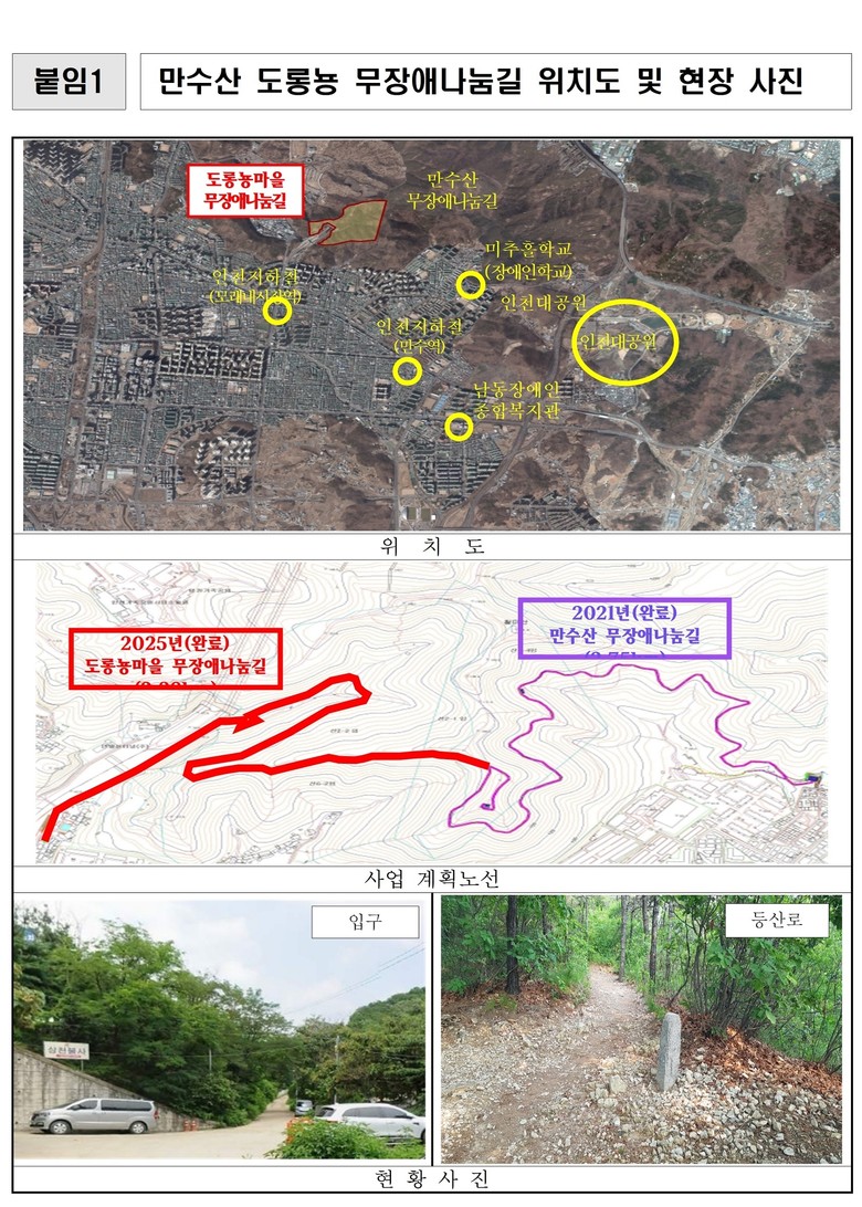 현재까지 인천시는 총 14개소의 무장애나눔길을 조성했으며, 올해는 서구 원적산에 31억 5천만 원을 투입해 연장 2.3km 규모의 산림복지 무장애나눔길을 추가로 조성할 계획이다.
