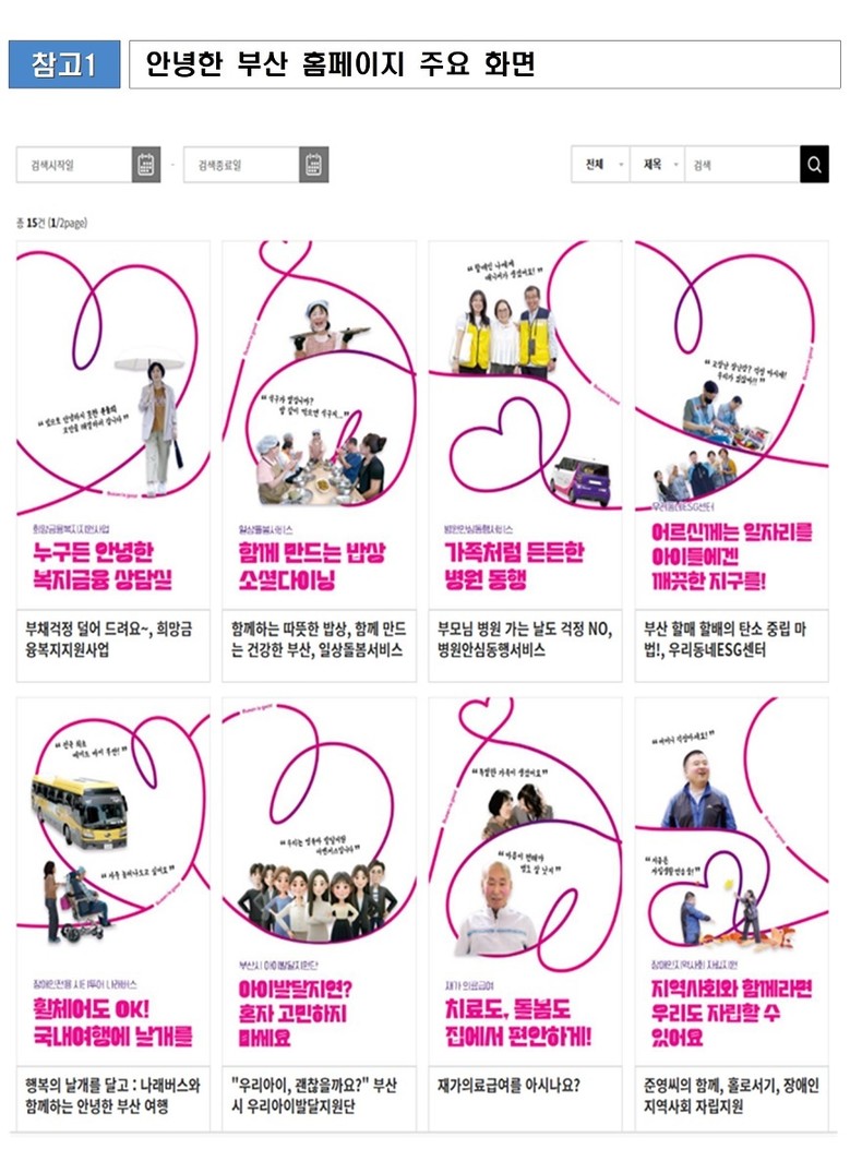 ◈ 누리집 메인 화면에 ▲우리아이발달지원 ▲공영장례 ▲재가의료급여 등 10여 편의 정책 영상 구성… '안녕한 부산' 디자인도 적용해 브랜드 가치를 시각적으로 표현