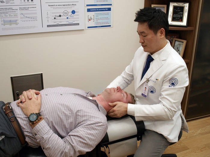 | ▲자생한방병원 김하늘 국제진료센터장이 보건의료전문가 연수단 중 한 명에게 추나요법을 실시하고 있다. |