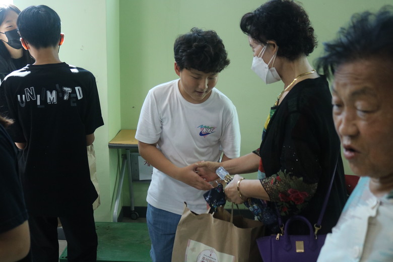 [대구 세계타임즈=한성국 기자] 대구용전초등학교(교장 배영서)는 2023년 9월 22일(금) 1교 1기부 봉사동아리 14명의 학생들이 추석을 맞이하여 성서노인복지관에서 「지역사회와 함께하는 행복취약계층 마음피트니스 대화기부사업 마음나누기」에 참여해 지역 어르신들과 소통의 시간을 보내고 80만원 상당의 추석 지원물품을 전달했다고 밝혔다.