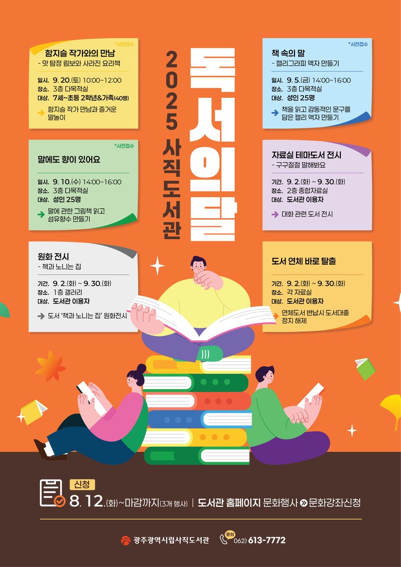 - 강연·체험·전시 등 책읽는문화 확산 기대…12일부터 사전접수 [광주 세계타임즈=손권일 기자] 광주시립도서관(무등·사직·산수·디지털정보)은 9월 ‘독서의 달’을 맞아 시민과 함께하는 다양한 독서문화 행사를 진행한다.