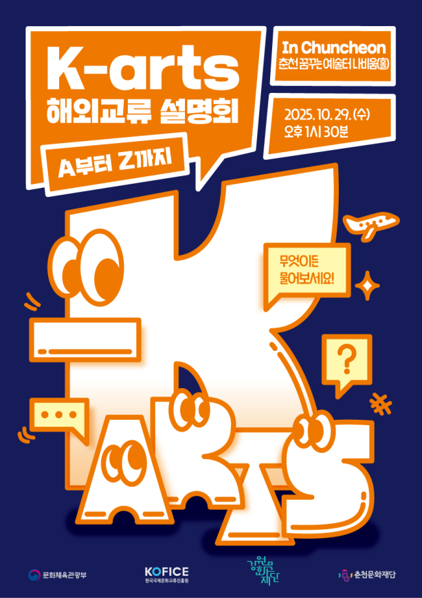 ・문화체육관광부 주최, 한국국제문화교류진흥원, 강원문화재단, 춘천문화재단 공동 주관 [강원도 세계타임즈=김민석 기자] 강원문화재단(대표이사 신현상)은 오는 10월 29일(수) 오후 1시 30분, 춘천 꿈꾸는 예술터 3층 나비움에서 개최되는 ‘K-arts 해외교류 설명회, A부터 Z까지’의 사전접수를 진행 중이다.