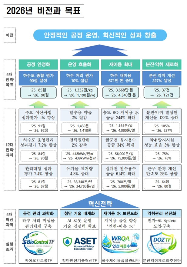 올해에는 △공정 안정화 △운영 효율화(원가 절감) △재이용 확대 △분진·악취 제로화를 4대 핵심 과제로 추진하며, 이를 통해 하수도 종합 평가 90점 달성, 처리 원가 10% 절감, 재이용 671만 톤 증대, 분진·악취 제로화 121건 개선을 단계적으로 실현해 나갈 계획이다.