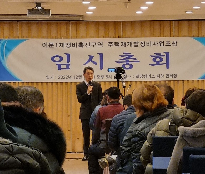 [세계타임즈 백진욱 기자] 지난 19일 오후 6시 동대문구 이문1구역 재정비촉진구역 주택재개발정비사업조합이 관내 웨딩헤너스 지하 연회장에서 350여 명의 조합원이 참석한 가운데 순조롭게 긴급 임시총회를 마무리 했다.