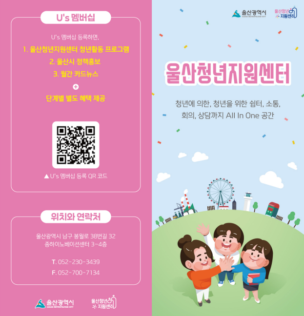 또 지난 3월 11일 공식 출범한 지역 거점 울산청년지원센터에서 운영하는 회원제(U’s멤버쉽)에 가입하면 센터 소식과 함께 종합적인 청년정책을 안내받을 수 있다. 기타 문의는 울산청년지원센터(052-230-3439)로 하면 된다.