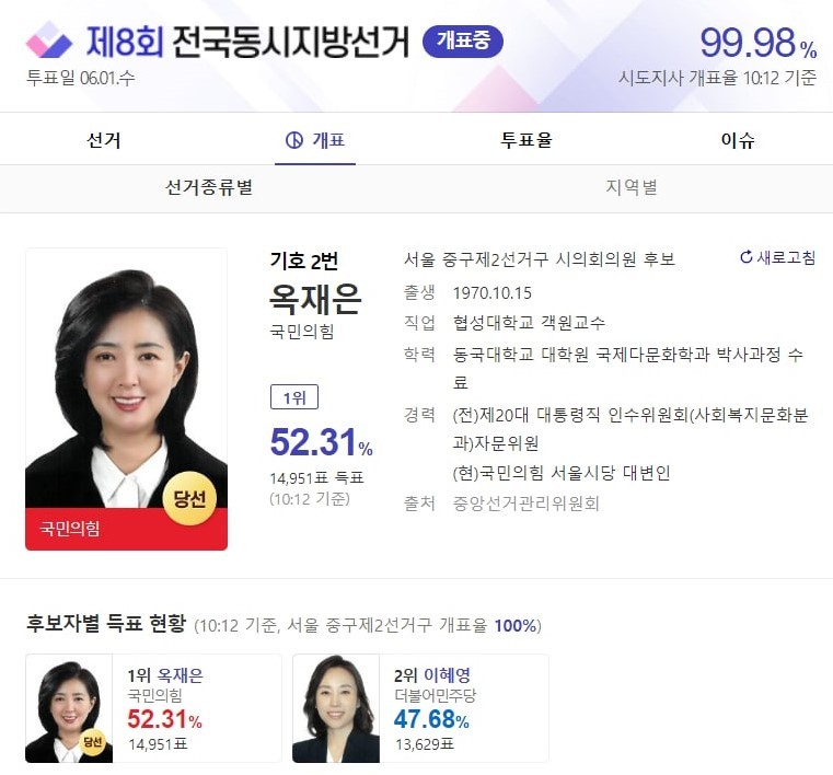 [세계타임즈 백진욱 기자] 국민의 힘 옥재은 후보가 제 8회 전국동시지방선거 서울 중구제2선거구에서 시의회의원으로 당선됐다.