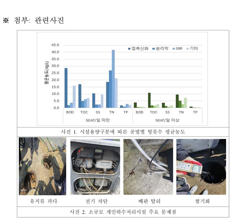 방류수 오염물질 농도도 소규모 오수처리시설이 50㎥/일 이상 시설 보다 BOD 15.5배, TOC 5.8배, SS 4.5배, T-N 3.0배, T-P 3.2배 높은 것으로 나타났다.(사진 1)