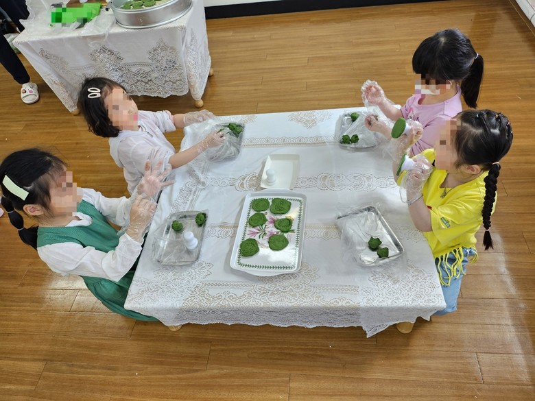 이번 첫 행복여행 활동으로는 봄의 정취를 한껏 느낄 수 있는 4월, 봄의 대표 식물인 쑥을 이용하여 쑥떡을 만든다. 아이들은 쑥이라는 식물을 가지고 떡을 만들 수 있다는 사실에 신기해 하며 전통무늬의 도장을 이용하여 떡을 정성스럽게 만들었다. 찜통 속에서 잘 익은 쑥떡을 예쁘게 포장하여 가정으로 가져가는 모습에는 스스로 만들었다는 뿌듯함과 부모님께 빨리 드리고 싶은 설렘이 담겨있었다. 아이들을 맞이하는 부모님들도 아이들의 손에 들려있는 떡을 보며 기특함과 사랑이 담긴 눈으로 바라보았다. 3세 자녀를 둔 한 학부모는 “쑥이라는 식물도 잘 모르고 집에서는 먹어보지 못한 쑥떡을 유치원에서 경험하니 너무 좋아요”라고 전했다.