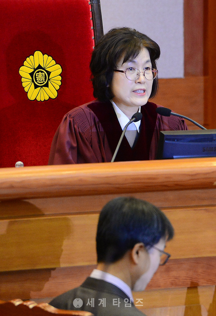 이정미 헌법재판소장 권한대행이 22일 오전 서울 종로구 헌법재판소 대심판정에서 열린 박근혜 대통령 탄핵심판 16차 변론기일에서 청구인, 피청구인 측 대리인단 출석을 확인하고 있다. 2017.02.22.