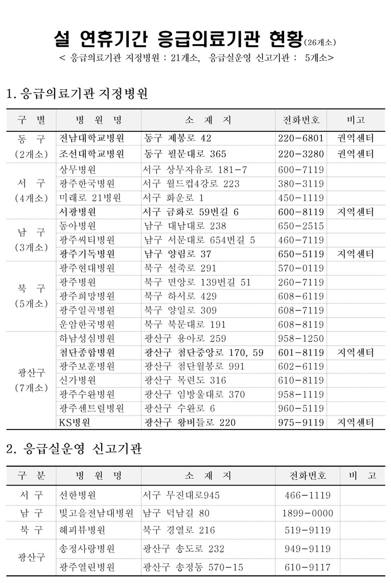 광주시와 5개 자치구는 설 연휴 기간인 1월25일부터 2월2일까지 응급진료상황실을 운영한다.