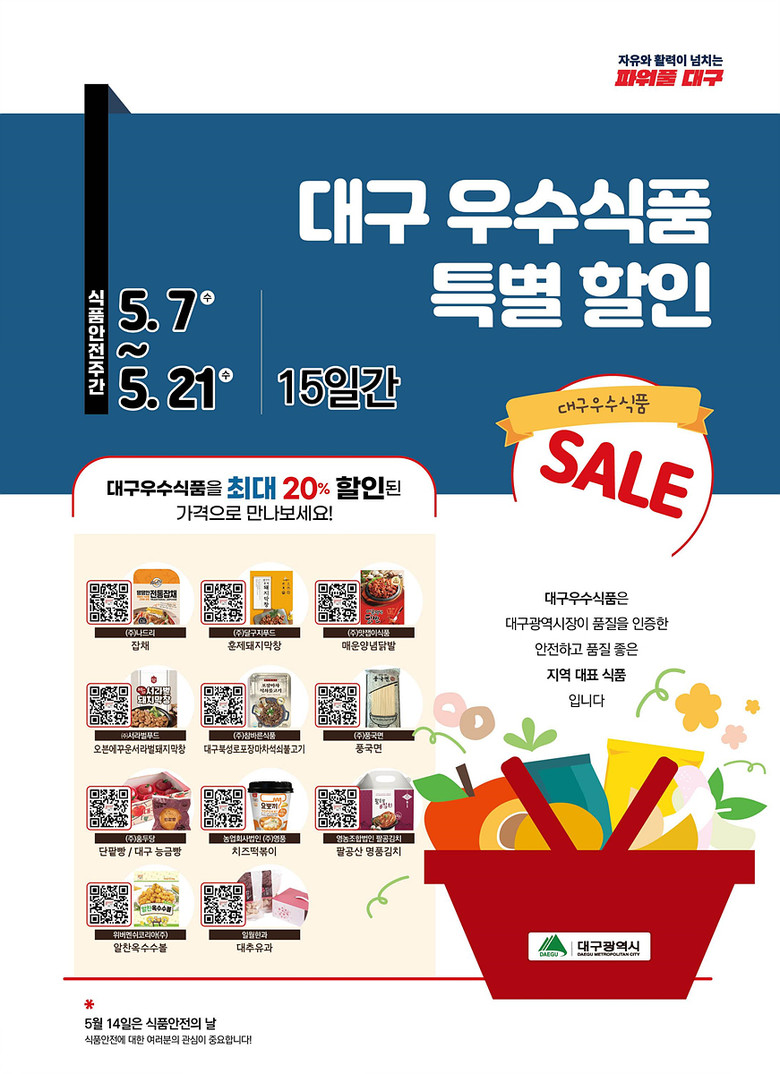 대구우수식품은 대구시에 본사를 두고 지역 내에서 생산되는 식품 중 대구광역시장이 품질을 인증한 식품으로, 대구시는 ‘식품안전의 날’을 맞아 식품안전주간 동안 시민들에게 안전한 식품을 합리적인 가격에 제공하기 위해 특별행사를 마련했다.