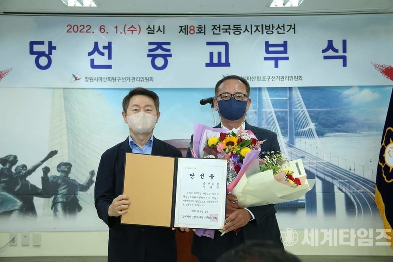 [세계타임즈 = 이진화 기자] 제8회 전국동시지방선거에서 당선된 국민의힘 정규헌 창원시 제9선거구 도의원 당선자가 창원시 마산합포구 선거관리위원회로 부터 당선증을 받고 기념촬영을 하고있다[정규헌 선거사무소 제공]