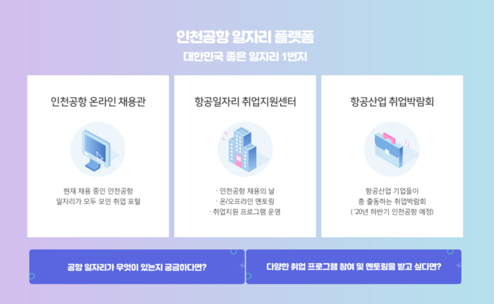 * 인천공항 일자리 플랫폼 : 인천공항 온라인 채용관, 항공일자리 취업지원센터, 항공산업 취업박람회로 구성